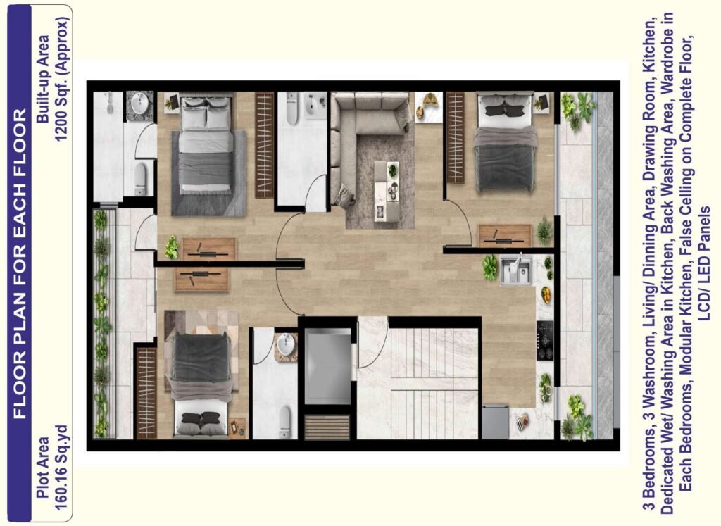 3 Bedrooms, 3 Washroom, Living/Dinning Area, Drawing Room, Kitchen, Dedicated Wet/ Washing Area in Kitchen, Back Washing Area, Wardrobe in Each Bedrooms, Modular Kitchen, False Celling on Complete Floor, LCD/LED Panels